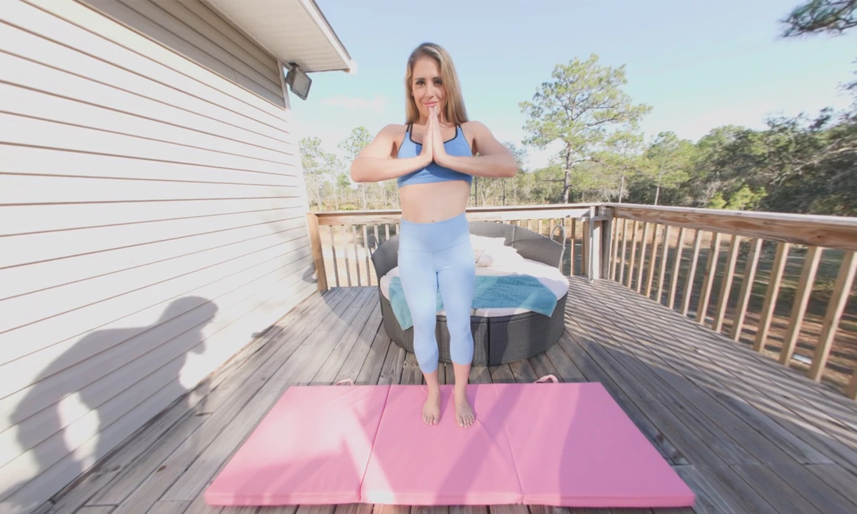 It's a beautiful day for yoga, so Angelica Amore brings her mat outdoors to soak up the sunlight. In the seclusion of her backyard, she removes her yoga clothes and begins her stretches. She enjoys the warmth of the sun on her bare skin as she loosens her muscles. The nude atmosphere arouses her, and we get to witness her touching herself to orgasm after finishing her yoga session, providing an enticing blonde VR porn moment reminiscent of a blonde vr porn virtual reality experience.
