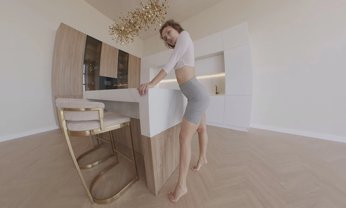 This gorgeous model looks like a girl next door. She has brunette, curly hair, and a cute smile on her face. To spice it all up, the temptress puts nerdy glasses on, ready to seduce you in VR. The unforgettable striptease show takes place in a well-lit apartment that quickly becomes the vixen's stage. Her white top barely hides her small but perky breasts, and her gray skirt puts the accent on her divine beauty. Feeling the urge to tease, the brunette lets her skirt hit the floor. Little by little, the curly goddess lets you see all of her divine curves.