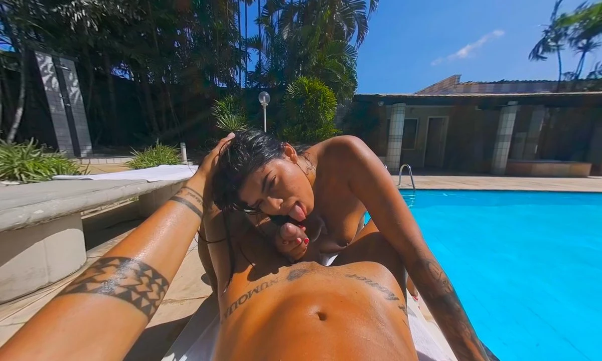 Laying by the pool grabbing some sun, this guy is just chilling, and then that’s when Maria shows up and shows off her hot body dressed in a skimpy bikini. When she reveals her nice scrumptious tits, he has no choice but to grab his own cock and wish it were inside her. Maria gets up and jumps in the pool and swims around just to tantalize him. She gets out, walks over to him laughing because she knows he’ll do whatever she wants. She rubs lotion on his body, he plays with her tits, she sucks on his dick and then she climbs on top so her shaved pussy can get penetrated by his dick. After a bit he stands up to take her doggy style and then shoots on her tits.