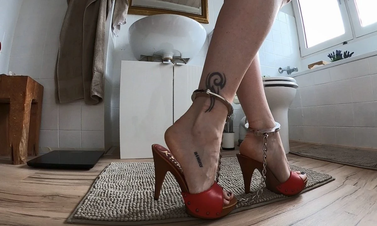 I ride the red dildo with mules and cuffed feet