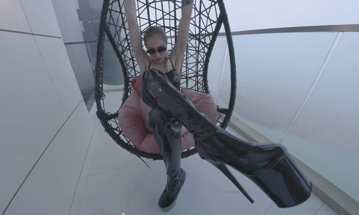 Natasha Vega stands on a balcony with the sea behind her, dressed in leather and high heels. She teases you with her big strap-on, playing with it close to you, letting you know what's in store. The scene is filled with anticipation and desire as she silently entices you.