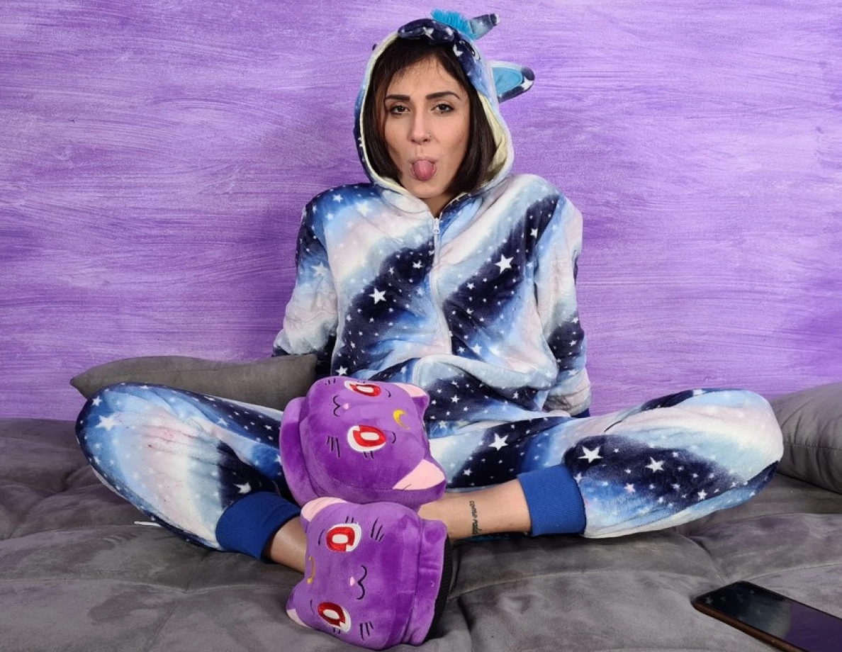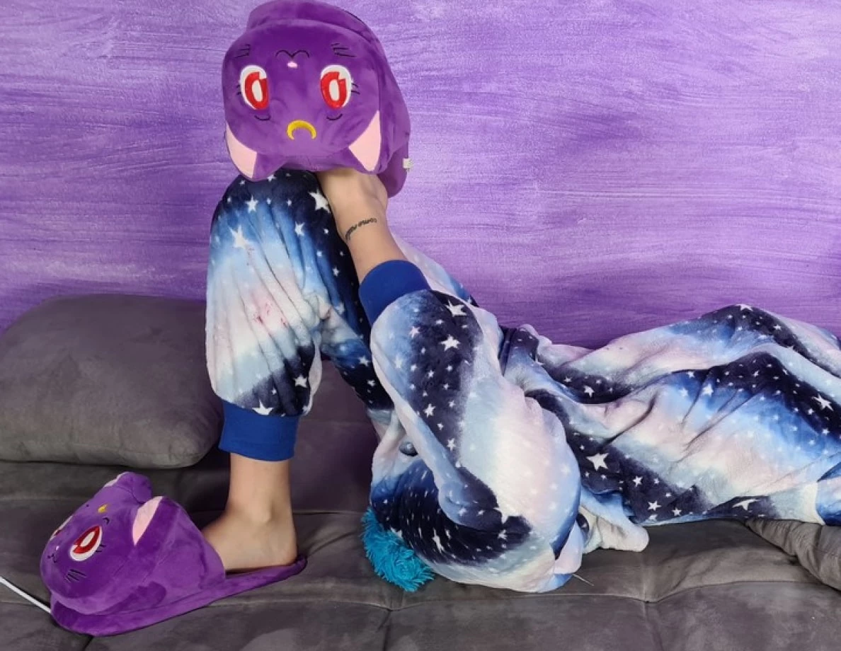Stunning Aradia In A One-Piece Hooded Pajama And Purple Slippers