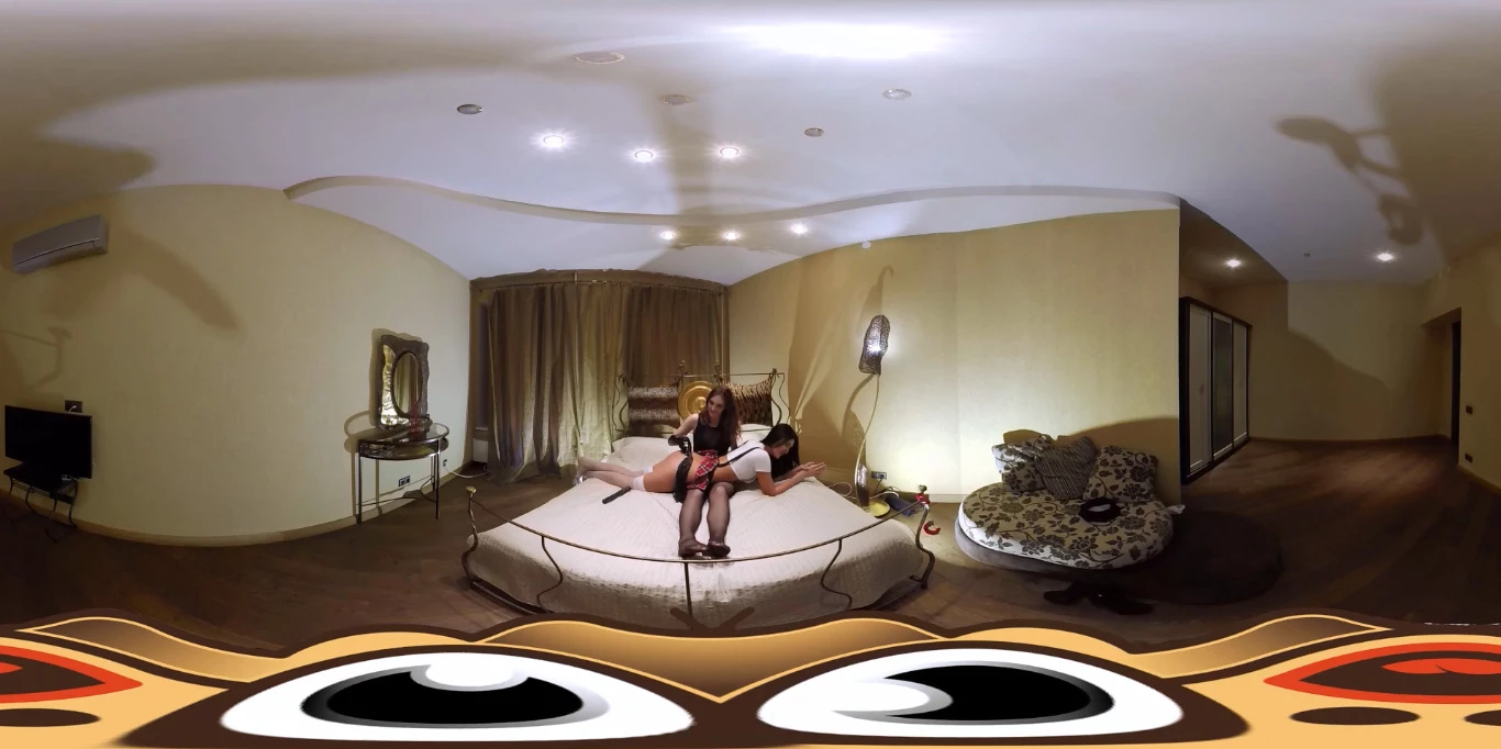 Bad girls must be punished. This dominate redhead knew her slut schoolgirl submissive was out flirting with guys so she made her get dressed in her sluttiest schoolgirl outfit and bend over to show her tight ass in a thong. The mistress moved to the bed and had the bad schoolgirl lay across her waist so she could pull her skirt up to spank that fine ass. When the punishment is done, the mistress strips her submissive down and instructs her to please her mistress by licking her pussy.