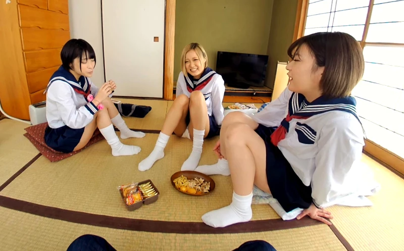 When class gets over these three cute, Japanese schoolgirls come by to study. One of them is your neighbor and the other her friends. These girls aren’t shy, sitting down with legs spread and bent over so you can see up their skirts and see their panties. The girls chat and have a snack then find your collection of porn magazines. The girls want to see your cock, so they sit on the floor in front of you while you pull your dick out and jerk it. Having three schoolgirls in uniform watching you turns you on so much you pop off and cum all over one of them then all three girls jump on you, sucking your dick, licking your nipples and begging you to fuck them.