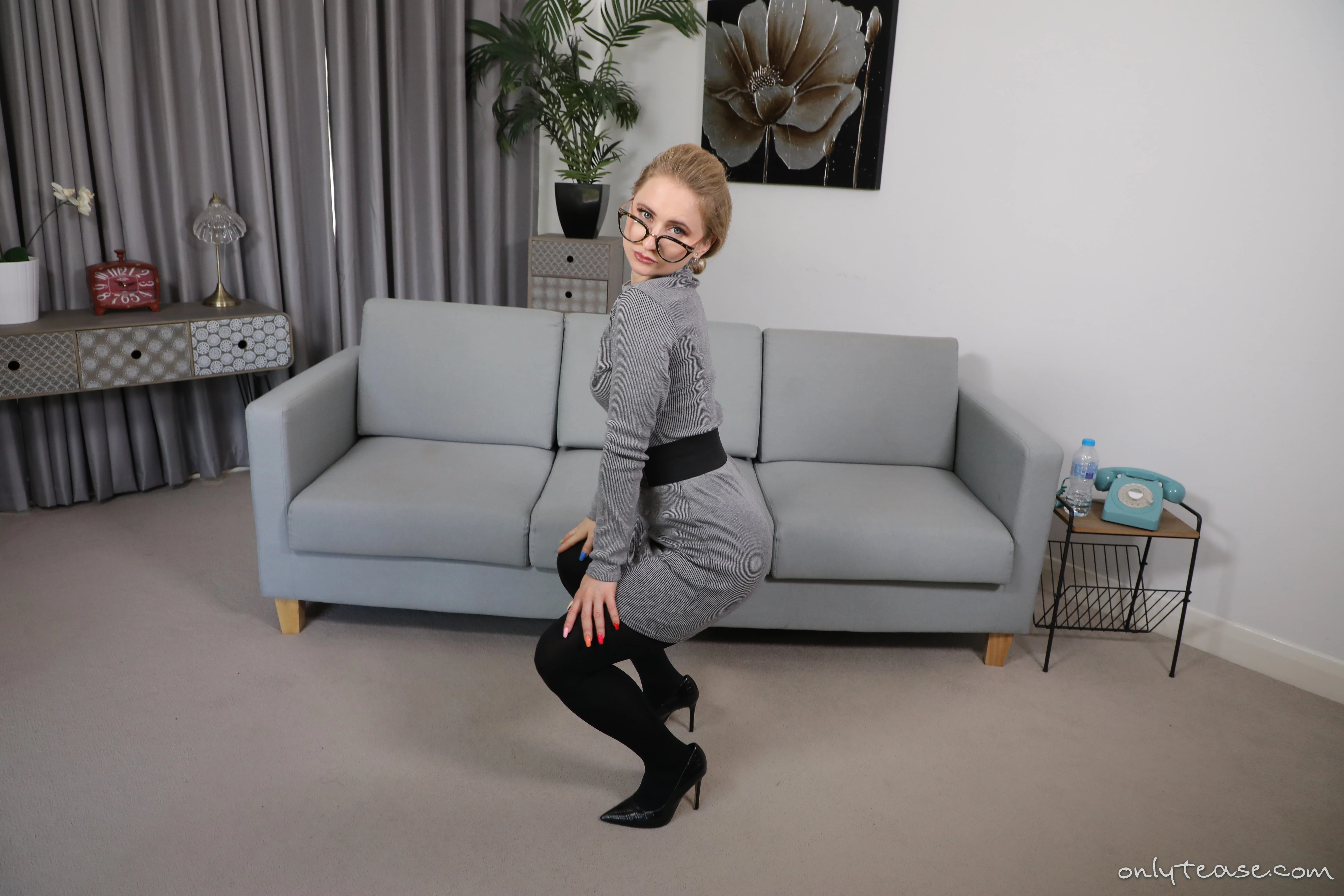 If you saw Luna in your class you would think the blonde girl was cute with her glasses and her body is nice in her tight dress. If you followed her home after class, you would see her body is even hotter than you thought. Pulling her dress off, the blonde babe then unhooks her bra and takes her perky tits in her hands. She is left wearing waist-high pantyhose over a sexy thong. Sticking that ass out, the bad girl reaches back and gives it a smack!