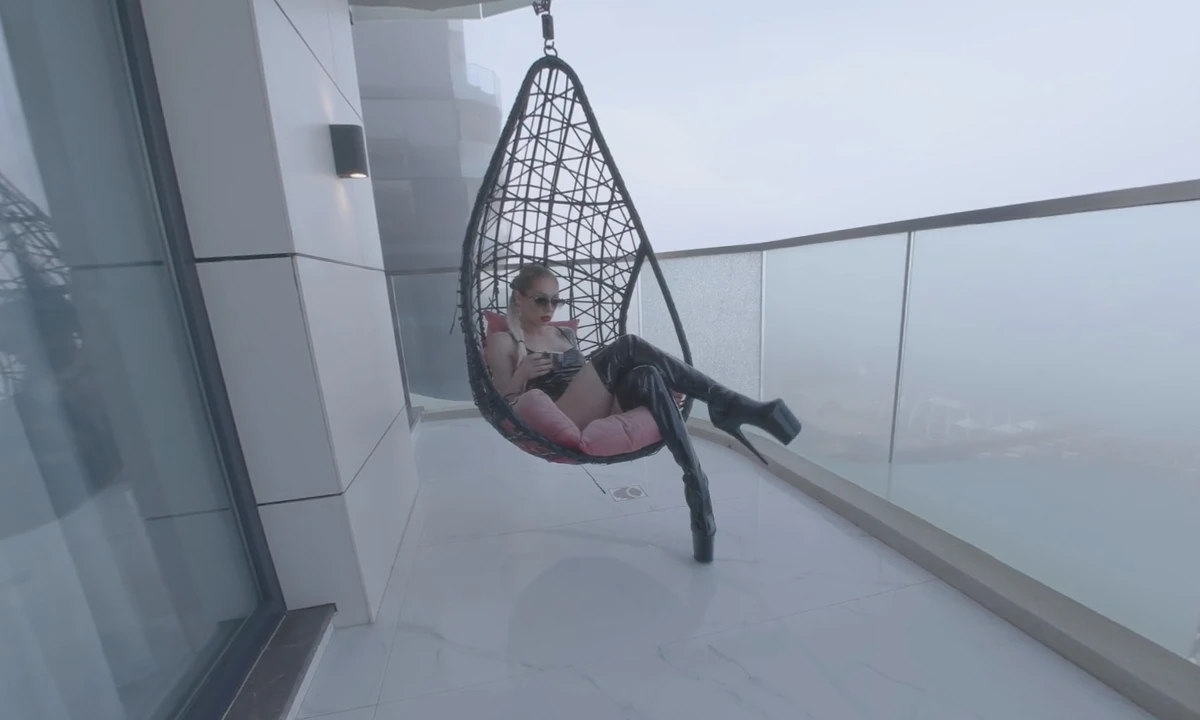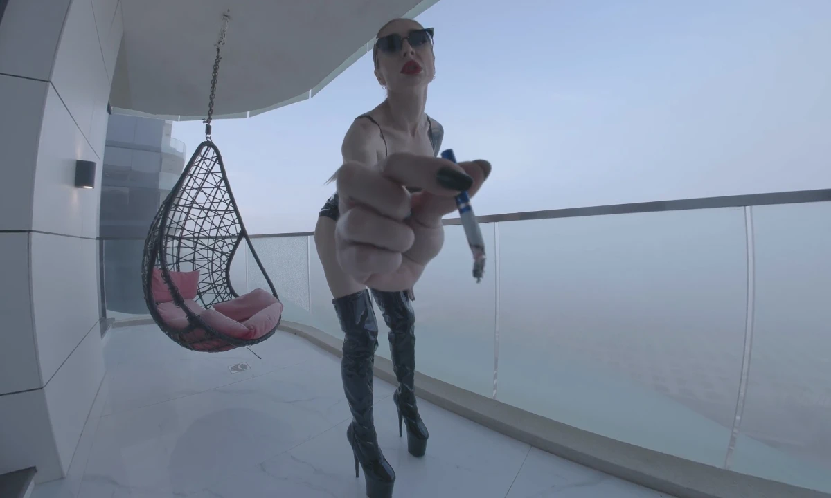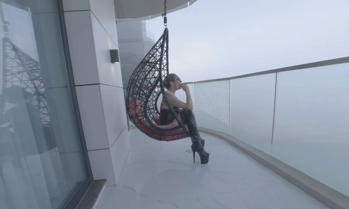 On a balcony overlooking the sea, Natasha Vega, dressed in leather and high heels, teases you in silence. She smokes and uses you as her ashtray, all while letting the waves and her presence speak volumes. This wordless encounter is filled with intense, erotic tension.