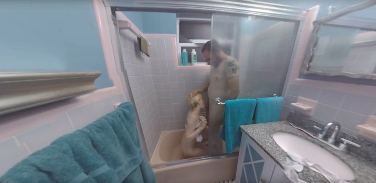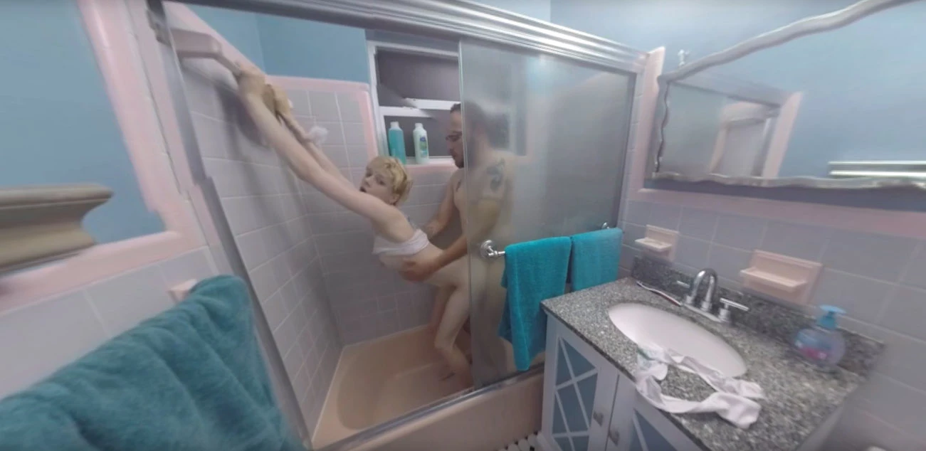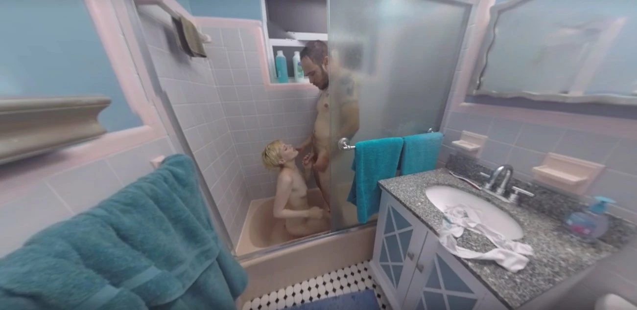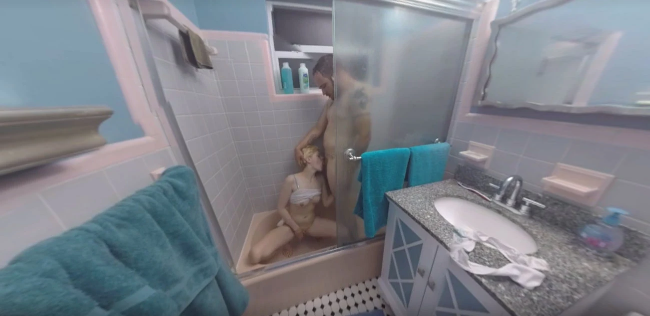This blonde hottie jumped in the shower with her man while still wearing the shirt she wore to bed. As they kissed, he pulled her shirt up and played with her tits then she went to her knees and sucked his cock. She wanted to start her day cumming on his cock so she spun around, arched her back, and let him hit it from behind. He fucked her with long, deep strokes, pounding that sweet pussy until she came so hard she nearly collapsed then she sat down and let him shower her hot body with his sticky load.